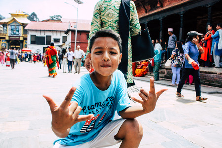 Kathmandu Nepal August 27, 2018 Portrait of unknown Hindu kid visiting the Pashupatinath temple in the morning