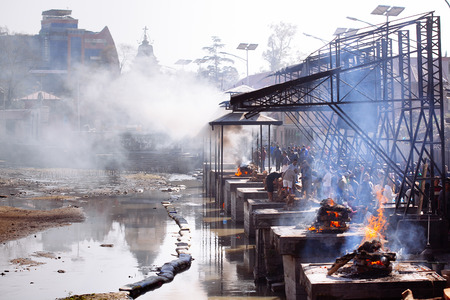 KATHMANDU, NEPAL - APRIL 17 2016: Hindu Cremations at Pashupatinath Temple in Kathmandu Nepal.
