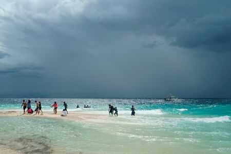 Moalboal. Cebu. Philippines - 06 aug 2016: Philippine families getting fun and rest while storm is coming to the tropical beach, from wavy sea at gray day