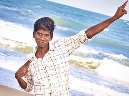 PUDUCHERRY, INDIA - DECEMBER Circa, 2018. Unidentified indian teenager raising arm in triumph at seaside. Young black boy standing on beach and showing winning gesture. Success concept
