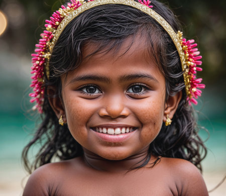 A young woman smiles brightly while standing in a colorful doorway, showcasing traditional attire and jewelry, radiating warmth and joy in a vibrant setting.