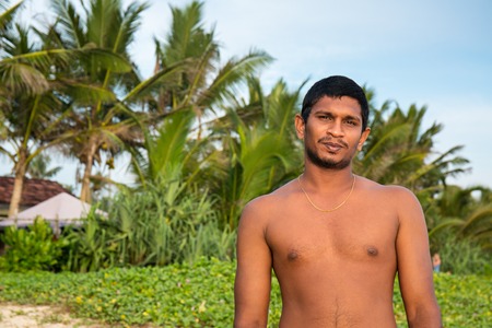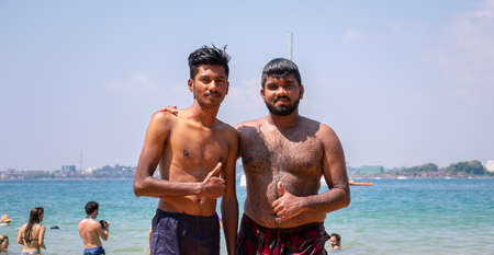 Galle, Sri Lanka - 01 31 2020: Brothers at the beach, giving thumbs up hand signal and posing in front of the jungle beach sea as the background close up portraiture photograph,