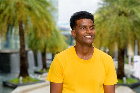 Portrait of handsome black African man wearing yellow t-shirt outdoors in city in Bangkok, Thailand