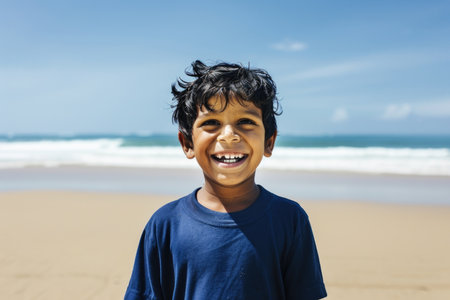 A young boy stands proudly atop a sandy beach, his eyes filled with wonder and excitement as he surveys the vast expanse of ocean before him.