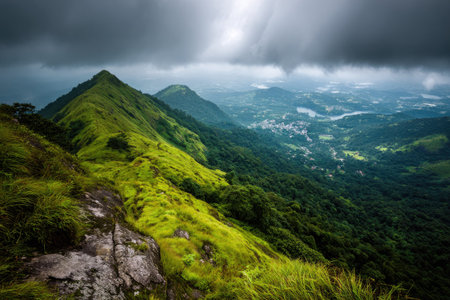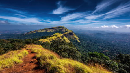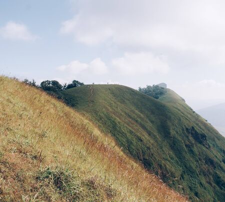 mountain with green grass and beautiful sky image is showing the amazing beauty and art of nature. This image is taken at karnataka india from hilltop.