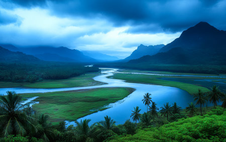 A serene river flows gracefully through a vibrant green valley surrounded by mountains and dense palm trees. Dark clouds hint at an impending storm creating a dramatic atmosphere.