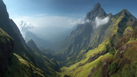 Explore a breathtaking mountain landscape filled with lush greenery and majestic peaks shrouded in mist, capturing the essence of nature's serenity and beauty.