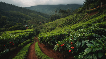 Experience the beauty of a tranquil mountain landscape featuring lush greenery, dramatic clouds, and a misty atmosphere, perfect for nature lovers and adventurers alike.