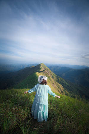 happy hiking woman on top of mountain at Khao Chang Puak, Thongphaphum National Park, Kanchanaburi Province, Thailand. Subject is blurred, noise and color effect.