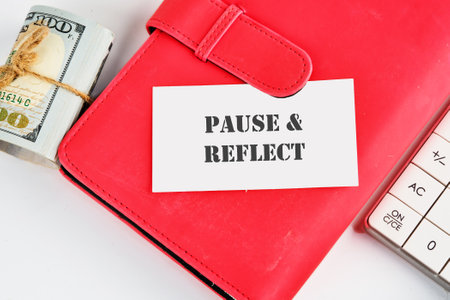 Pause and reflect word on a business card on a red notebook with dollars and a calculator lying next to it