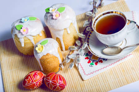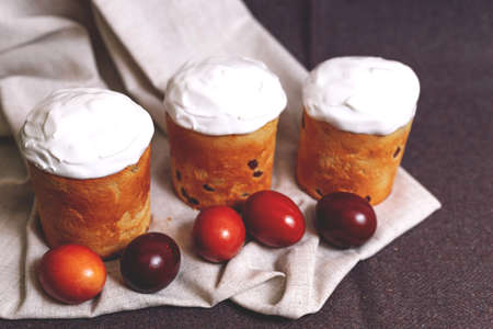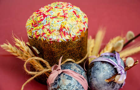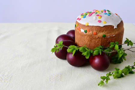Traditional Easter cake with decorative glaze. Orthodox food after fasting on the Easter holiday. Red-painted chicken eggs on a light tablecloth