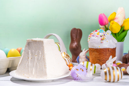 Traditional orthodox Easter paskha curd cake. Simple Easter vanilla cottage cheese dessert, with Easter eggs, spring flower and decorations copy space