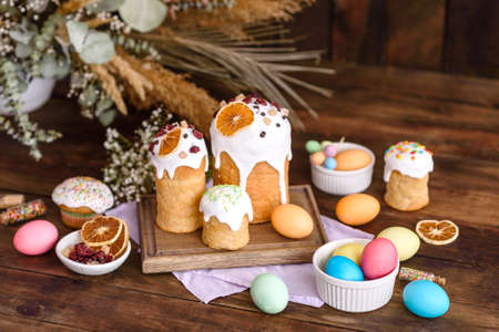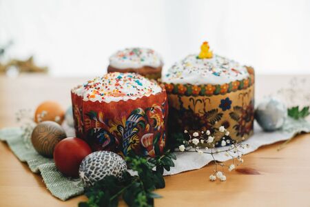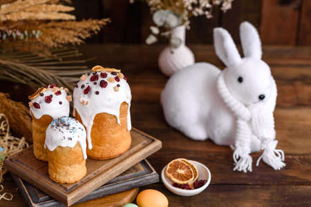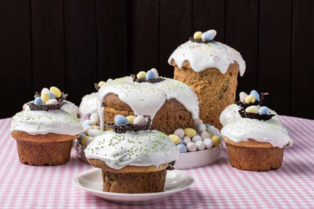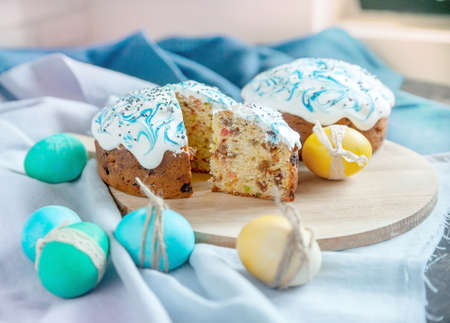 Festive cakes with white glaze, nuts and raisins with Easter eggs on the festive table. Preparations for Easter