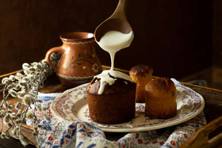 Orthodox traditional cooking of cakes with icing for Easter celebration