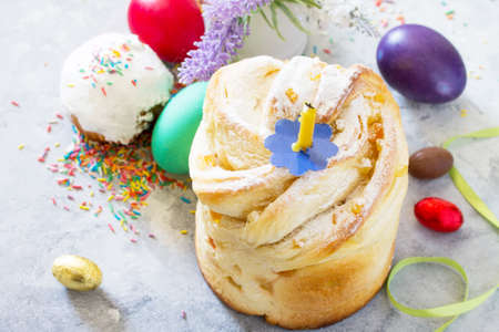 Easter background. Traditional food on the holiday table bread cake with candied fruits and easter eggs. Easter recipe.