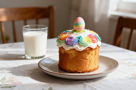 Easter cake and Easter eggs festive celebration table setting traditional decoration and treats