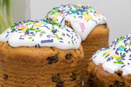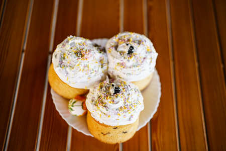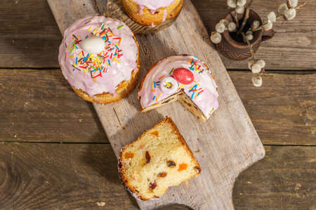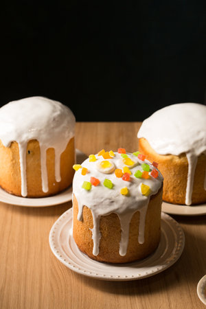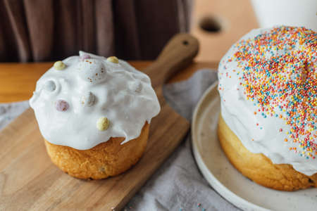 Homemade easter breads on rustic table in room. Happy Easter! Freshly baked easter cakes with sugar glaze and sprinkles, traditional ukrainian bun