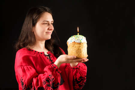 A Ukrainian woman in embroidered red national clothes holds an Easter cake on a black background
