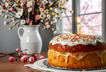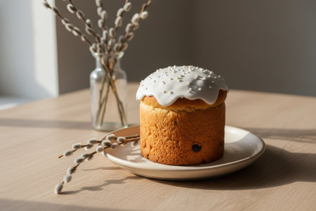 A freshly baked Easter Kulich cake adorned with sweet glaze and sprinkles, placed beside a vase of willow branches and spring blooms.
