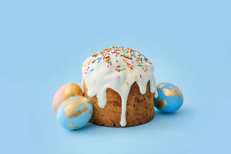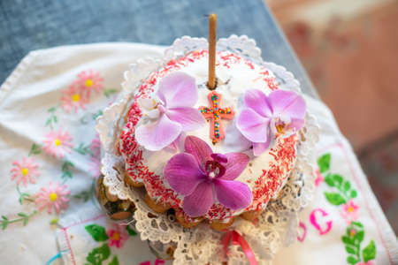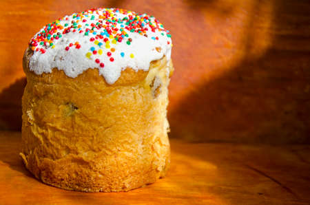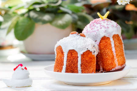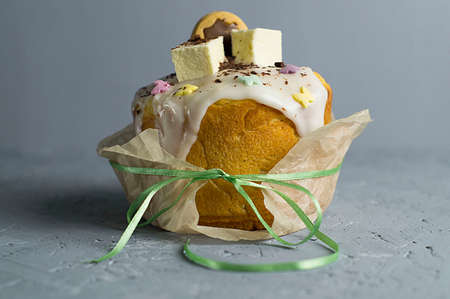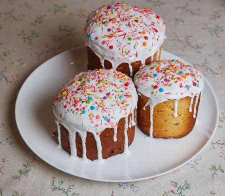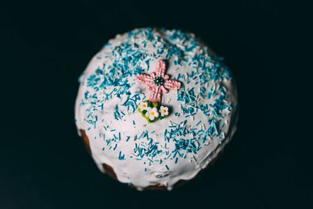 Easter sweet bread Orthodox kulich, paska decorated with icing.