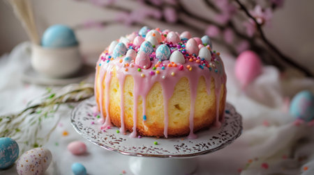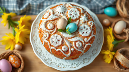 Festive Easter background featuring an Easter bread cake adorned with glaze, chocolate, and eggs. Ideal for an Easter greeting card, ad, promotion, or poster, showcasing a vibrant composition and