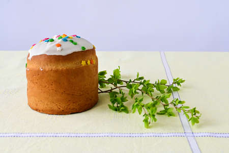 Traditional Easter cake with decorative glaze. Orthodox food after fasting on the Easter holiday. A branch of a tree with young green leaves on a light tablecloth.