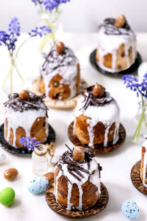 Homemade traditionla small Easter kulich cakes with chocolate nests and eggs on plates decorated with muscari flowers over white background. Traditional ortodox easter Russian Ukrainian bake