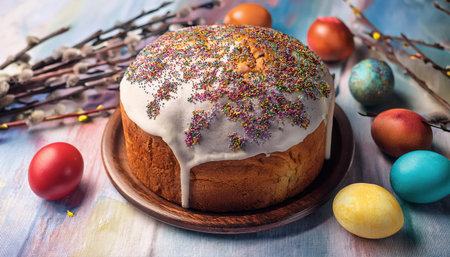 A beautifully presented Easter Kulich cake with colorful glaze, sprinkles, and willow branches artfully arranged in the background.