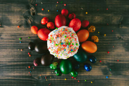 The traditional Easter treats: cakes and colorful easter eggs on a table in a rustic style. Copy space.