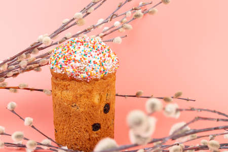 Easter cakes with willow twigs on pink background. Easter holidays breakfast concept with copy space.