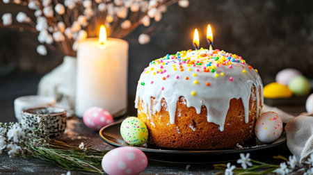 A festive Easter spread with a Kulich cake topped with glaze and colorful sprinkles, accompanied by willow branches and decorative candles.
