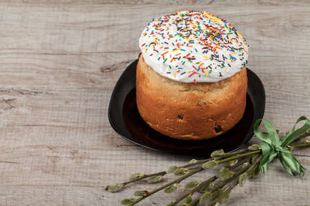 Traditional Easter Kulich with Icing and Willow Branches, Symbolic of Russian Pascha