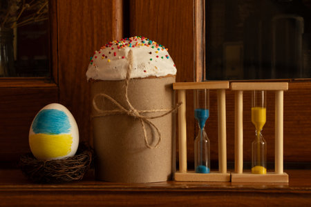 Easter cake with a painted egg in the colors of the Ukrainian flag and an hourglass on a wooden cabinet, Easter in Ukraine and time