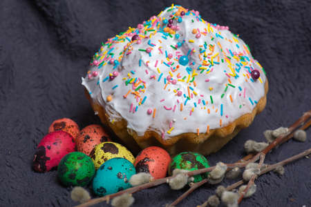 Easter cake, colorful eggs and willow branches on dark background. Happy Easter holiday concept