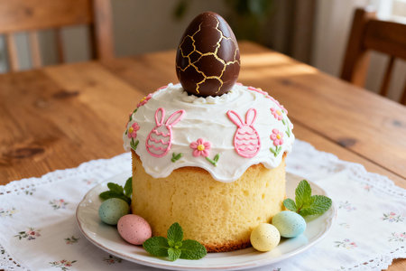 Easter cake and Easter eggs festive celebration table setting traditional decoration and treats