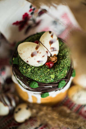 Easter pie in eco-style decorated in the form of a nest with eggs on the background of the national traditional towel