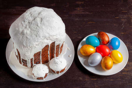 Homemade craft Easter cakes covered with white icing and multicolored painted Easter eggs on plates on a dark wooden background.