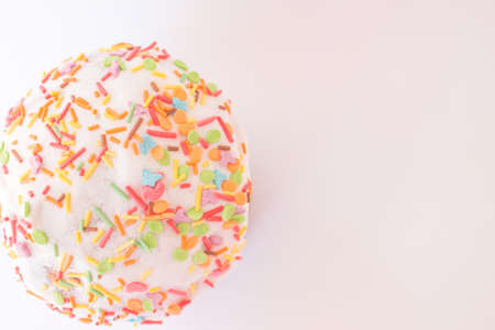 Easter holiday card with cakes and pies for happy saint easter day. White cream on an airy muffin with bright sprinkles of different colors. Happy easter concept. Copy space for your text.