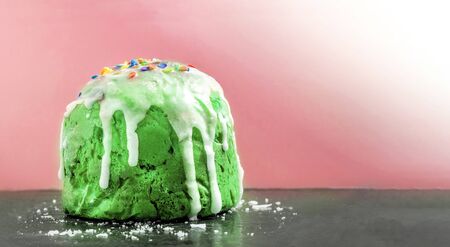 Homemade easter cakes painted green food coloring with icing and colored confetti close-up standing on a black surface with icing crumbs on a pink background. Morning baking, easter card with copy space