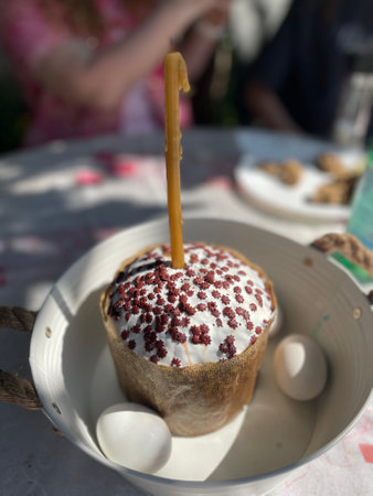 Russian Easter orthodox bread - Kulich. Festive Easter baking. Copy space.