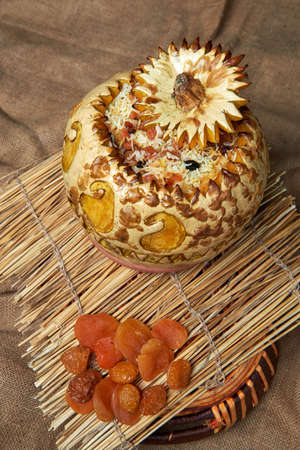 Azerbaijani traditional rice baked in clay stoves in natural pumpkin with dried fruits and raisins