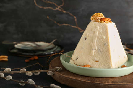 Traditional cottage cheese Easter paskha on wooden table, space for text