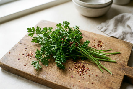 Fresh bunch of vibrant green parsley lies on a rustic wooden cutting board surrounded by scattered red chili flakes near a window with soft natural lighting.