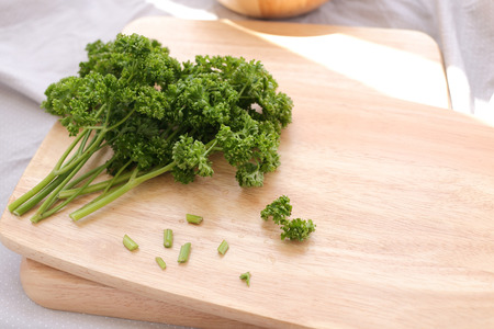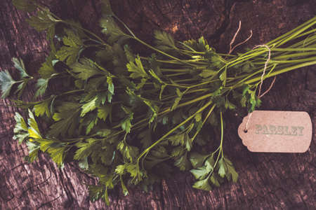 Bunch of fresh organic parsley on a rustic wooden background. Close up