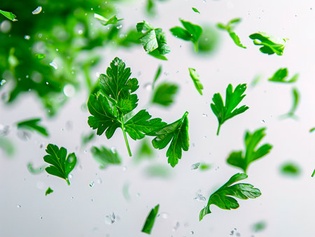 Parsley isolated on white background, clipping path, full depth of field photography of CILANTRO falling from the sky, hyperpop color scheme. glossy, white background