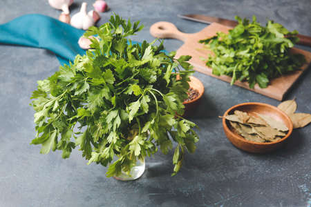 Fresh parsley bunch and copy space. Organic parsley on textured background, text space. Parsley for good health.