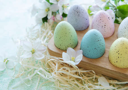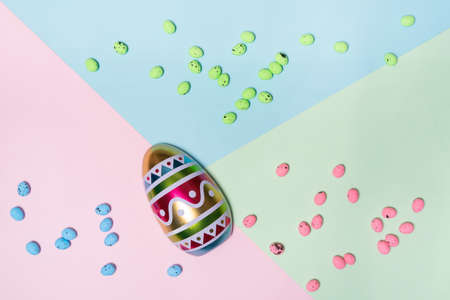 holiday preparation Multi colors Easter eggs on colored background . Pastel color Easter eggs. holiday concept with copy space.