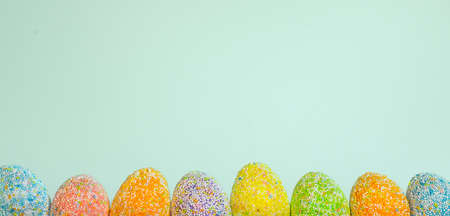 Row of painted colored easter eggs on blue background. Happy Easter background.