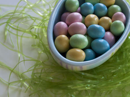 Easter colorful eggs in a bowl on white wooden background. Top view