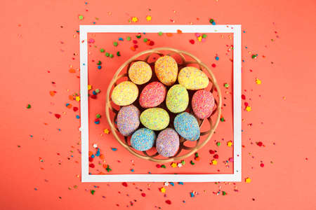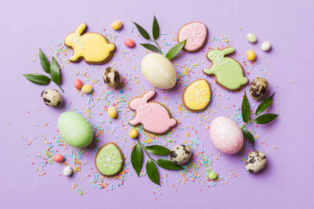 holiday preparation Multi colors Easter eggs with cookies on colored background . Pastel color Easter eggs. holiday concept with copy space.